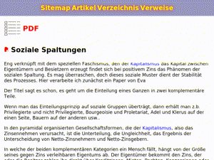 Die faschistisch organisierten Eigentum[+]s- und Machtverhältnisse im Kapitalismus[+]; Terminologie für Organisationsformen und Definition des Faschismus; Harmonie; Rang; Schuld und Zwang[+]; Faszination; Die Zins[+]sekte, der theo-ökonomische Komplex und seine Evolution[+]; Das kapitalistische Wertsystem, sein Darwinismus und seine Übertragung; Prinzipien der Wertung, der Ungleichwertigkeit und der Wertung des Selbst; Machtmittel in der Verzerrung des Gleichgewichts der Bestimmung; Teile und Herrsche; Gewährung von Kredit; Durchsetzung von Begünstigungen über das politische System: Subventionen ud Steuererleichterungen; Das Phänomen des Faschismus im Europa des 20. Jahrhunderts; Die grobe Struktur des Kapitals und des internationalen Banken[+]-Systems; Der Begriff des Recht[+]sinstituts; Demokratische Elemente im Kapitalismus[+]; Referenzen / Einzelnachweise