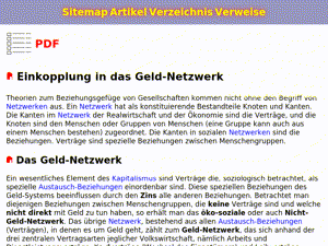 Einkopplung in das Geld-Netzwerk; Das Geld-Netzwerk; Vertragsarten, Austauschformen und Erwerbsklassen; Zuordnung von Eigentum[+]s und Besitzgütern[+], Eigentum[+]s und Besitzverhältnisse oder Güterbeziehungen; Vertragsarten; Einteilung in Geld- und Güter-Erwerbsklassen; Formen der Bestimmung im Vertrags- und Gesetzesraum; Bürger und Staat; Mengen im Vertrags- und Gesetzesraum: Ökonomie[+], Politik, Wirtschaft, Handel, Arbeit und Dienstleistung; Kopplung psychischer[+] und sozialer System: Subjektive, Konsensuale und Oktroyierte Bewertungen; Zins[+], Verhalten und Bewertung; Referenzen / Einzelnachweise